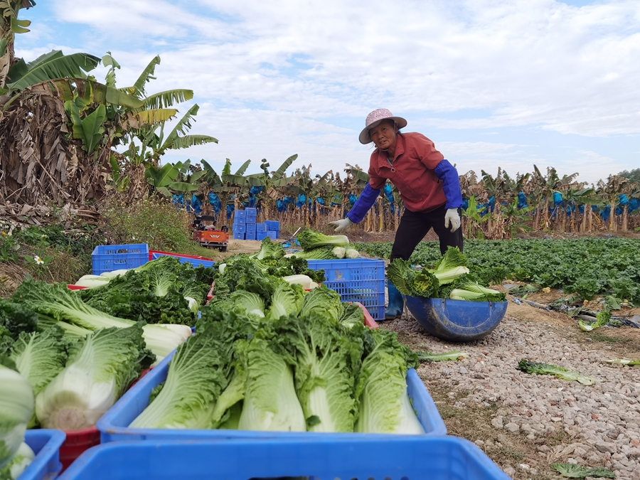 村民在供銷農(nóng)場(chǎng)采摘蔬菜。