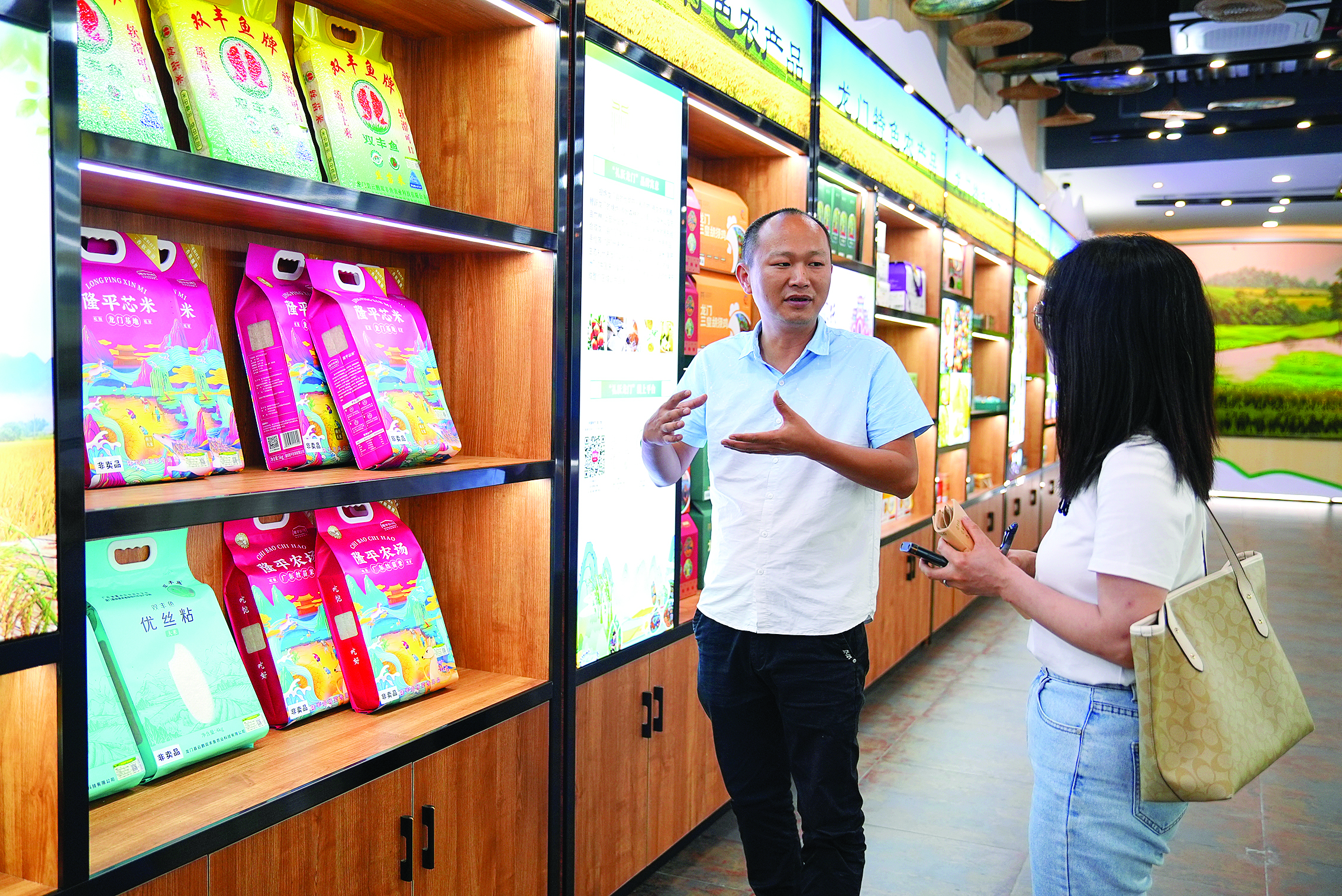 工作人員為游客介紹大米產(chǎn)品。惠州日?qǐng)?bào)記者哈鵬 攝