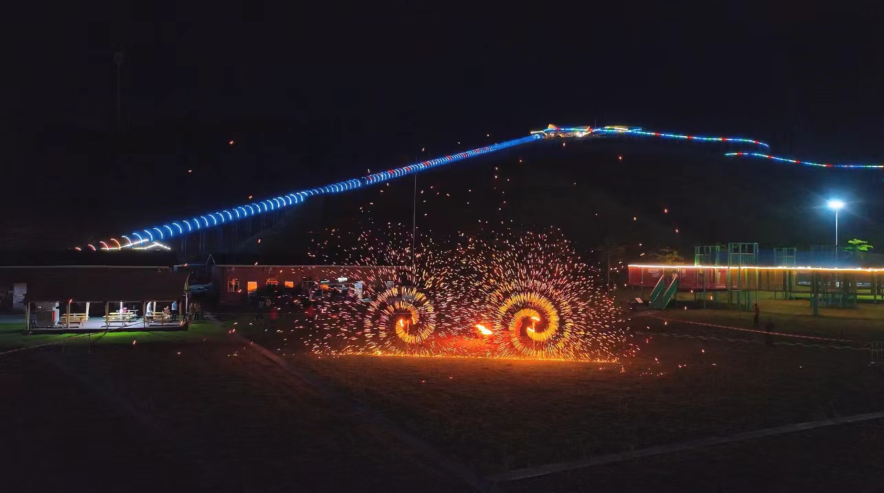 除了現(xiàn)代光影藝術(shù)的展現(xiàn),鹿鷹園還深度挖掘并呈現(xiàn)了中華文化的瑰寶。國家非物質(zhì)文化遺產(chǎn)項目“打鐵花”與龍門藍田瑤族鄉(xiāng)的省級非遺“舞火狗”相繼登場,尤其是圍繞篝火展開的舞火狗活動,不僅展示了傳統(tǒng)文化的獨特魅力,更激發(fā)了游客的參與熱情,大家手拉手,圍繞篝火共舞,享受這份來自傳統(tǒng)文化的狂歡。舞火狗第六批非遺傳承人羅楚燕說:“我們希望通過這樣的平臺,讓更多人了解舞火狗的歷史和文化內(nèi)涵。未來,我們計劃與鹿鷹園長期合作,定期在周末或節(jié)假日安排演出,讓非遺文化活起來、傳下去!