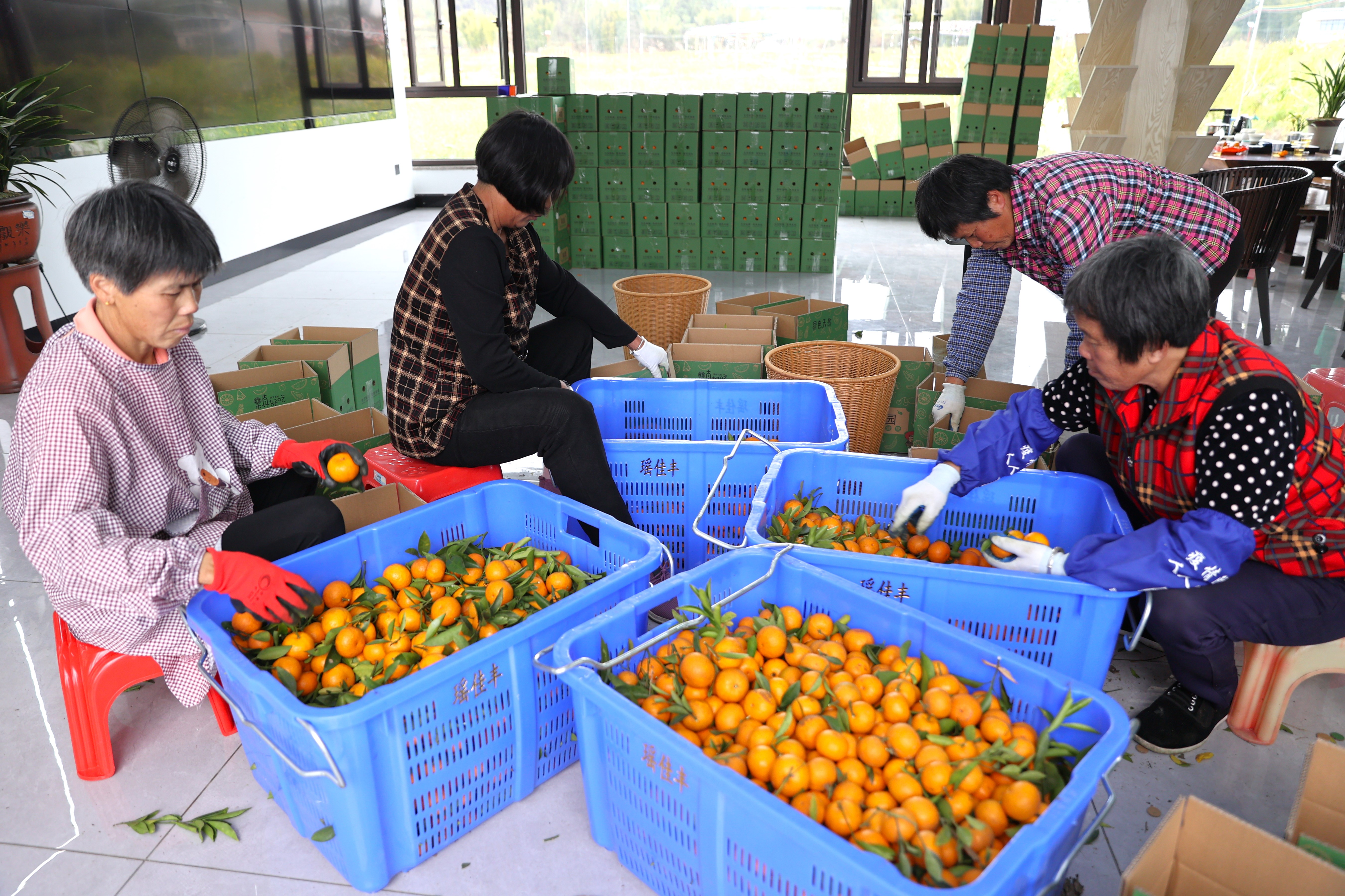工作人員將農(nóng)產(chǎn)品裝箱打包;葜萑請笥浾咝ゃ 羅劍業(yè) 攝