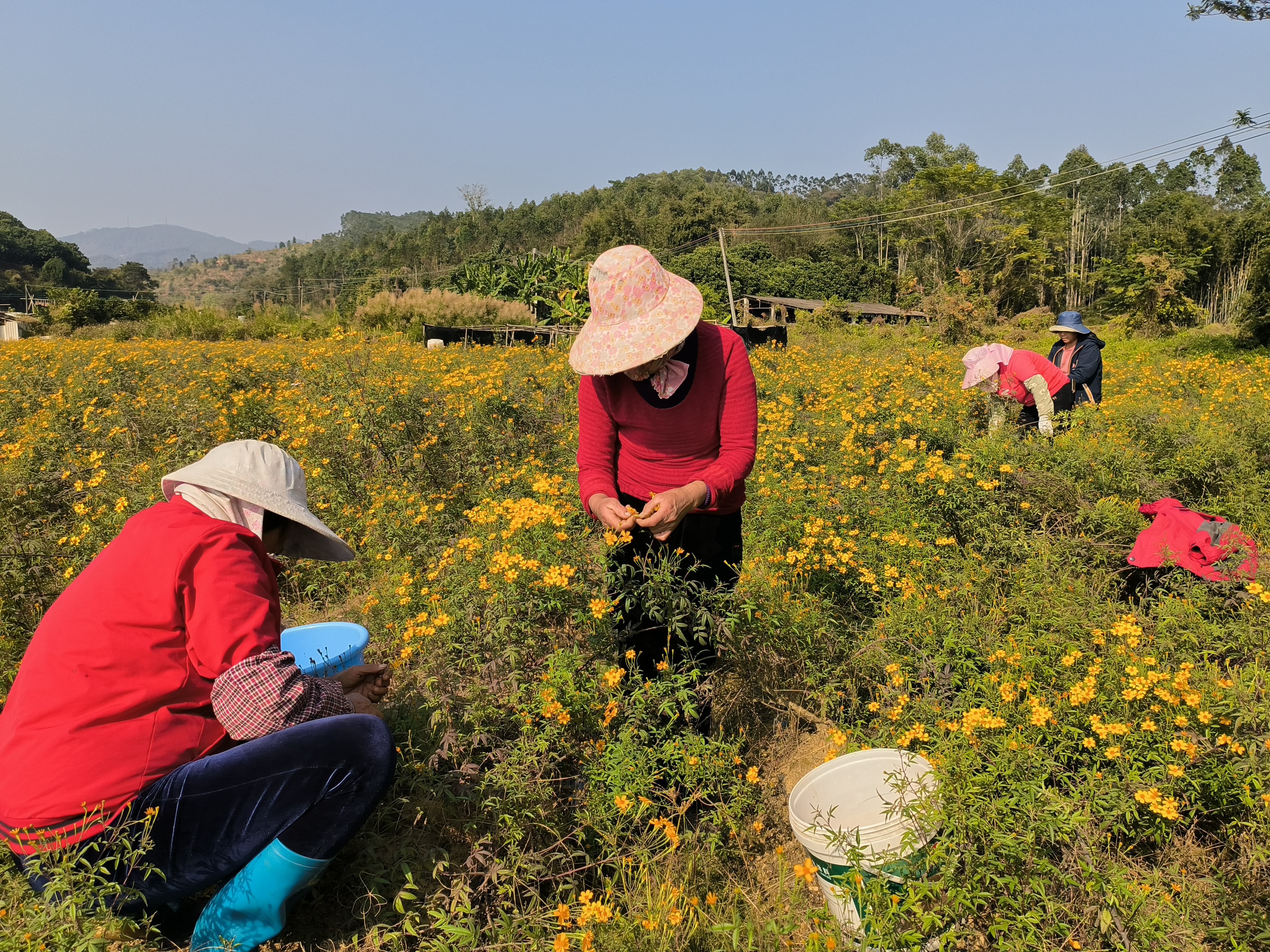 芳香萬壽菊花期有5個(gè)月長,每年的11月底就進(jìn)入開花期及采摘期,5至7天采摘一輪,可采摘至次年4月。吳三毛聘請?zhí)锱拼宓拇迕駚聿烧头謷枷闳f壽菊,然后按重量現(xiàn)稱現(xiàn)結(jié)工錢給村民。高峰時(shí)期,吳三毛聘請的村民達(dá)到二三十人,由于該村留守中老年人較多,吳三毛聘請到的多為中老年人。
