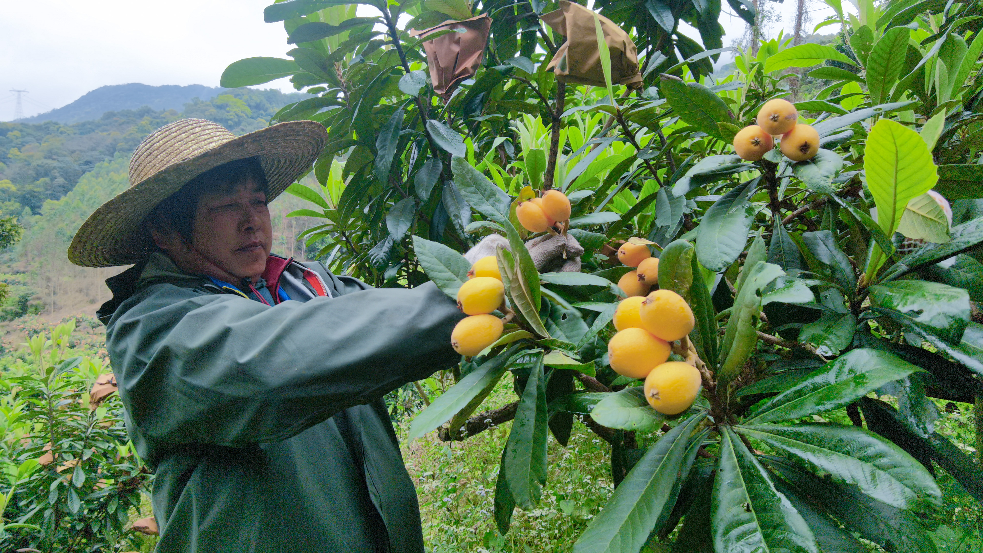 走進群山環(huán)繞的果園,延綿的山坡上、平緩的山地間,依地勢種滿了果樹,一片片枇杷林郁郁蔥蔥,枇杷樹上都套上了黃色的紙袋。走近一看,一顆顆枇杷沉甸甸的,累累碩果壓彎了枝頭。漫步其中,陣陣枇杷清香鉆入鼻腔。果農(nóng)們穿梭林間,忙著挑選、采摘、分揀,一派喜人的豐收景象。