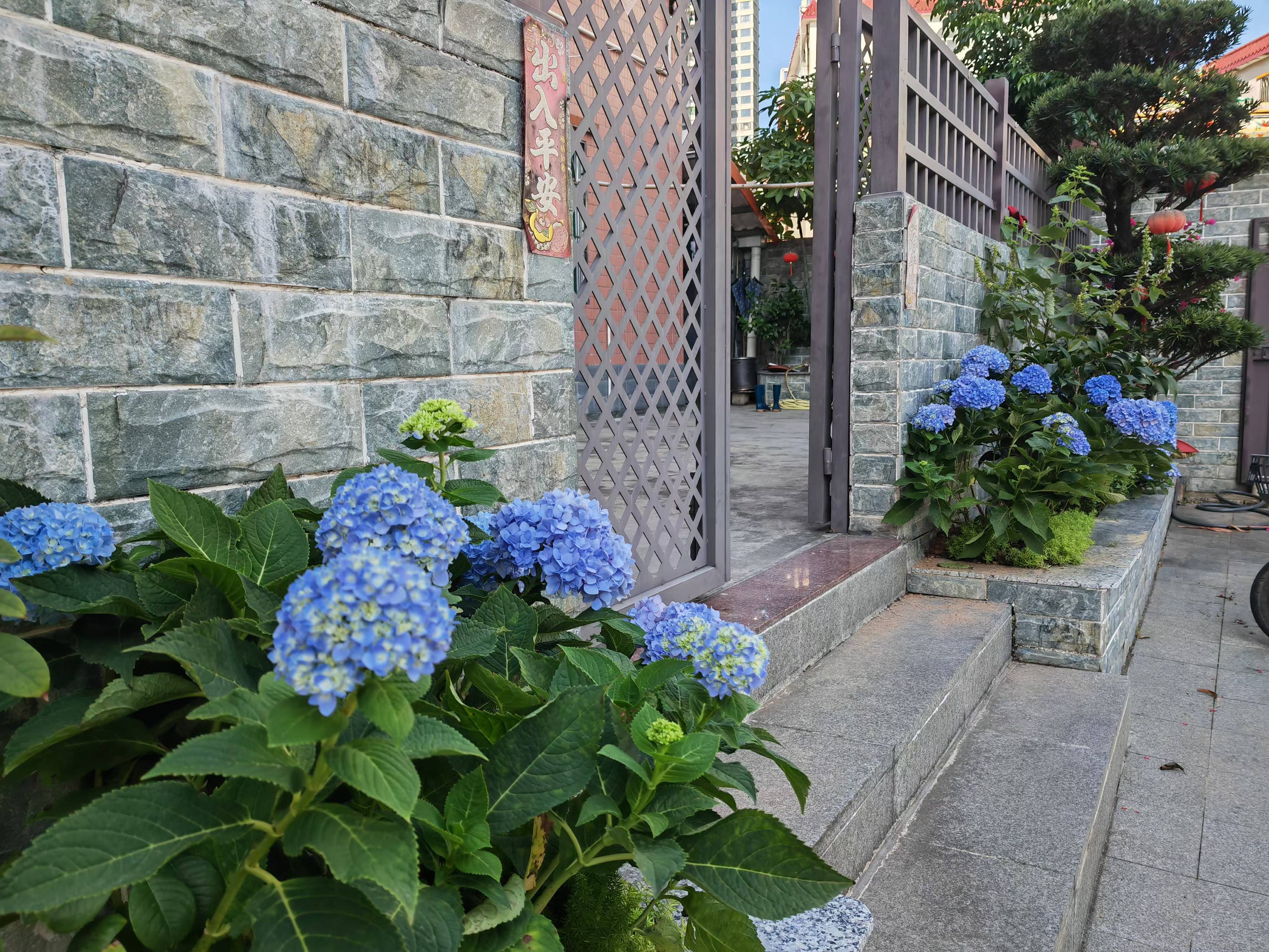 在衙前村生態(tài)塘一側(cè),梁女士家的庭院同樣吸引眼球:矮墻之下,一排藍(lán)色花盆整齊排列,盆內(nèi)紅色三角梅、紫色繡球花、綠色山茶花交相輝映,構(gòu)成了一幅五彩斑斕的畫卷。在此之前,這個庭院還只是一片空曠之地,未曾有過這般生機(jī)盎然之景。庭院的美麗蛻變讓梁女士一家滿心歡喜,梁女士一家主動接通水管為花卉澆水,呵護(hù)這份美麗。