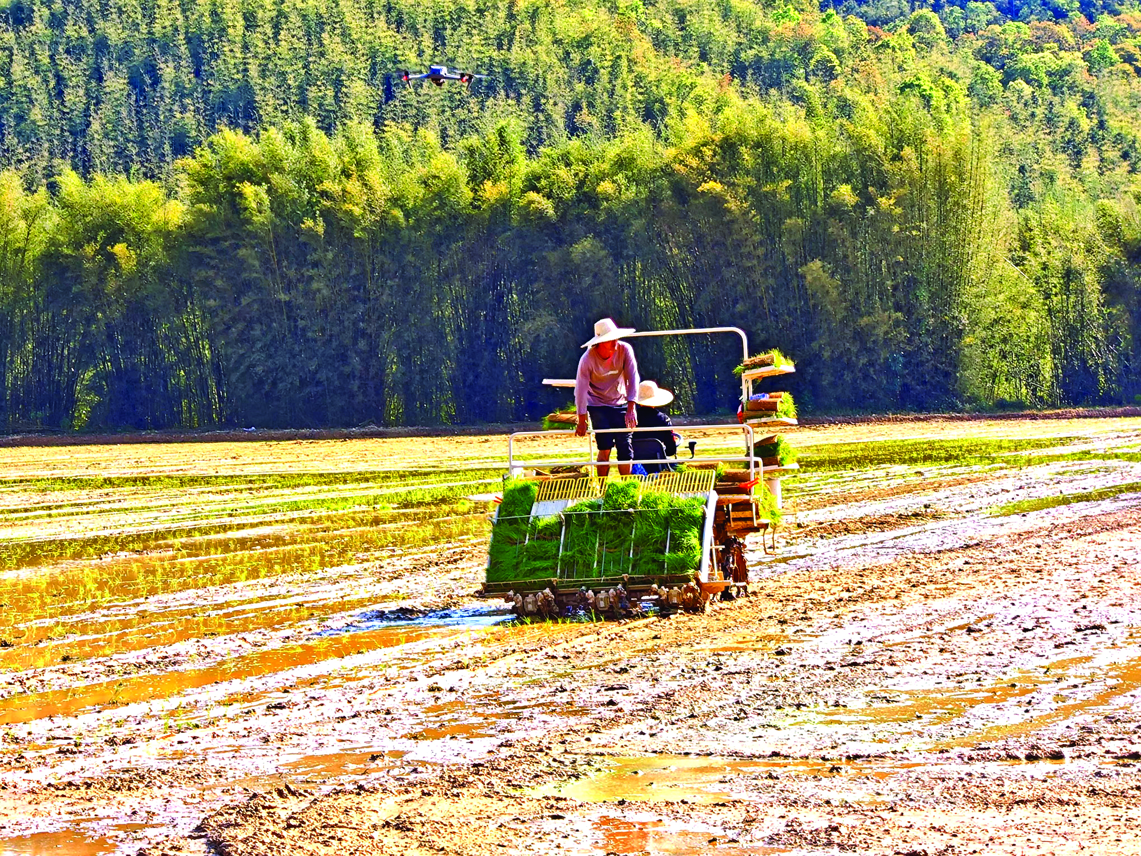 在蘆洲鎮(zhèn)嵐星村標(biāo)準(zhǔn)農(nóng)田里,機(jī)械轟鳴,三臺(tái)翻地機(jī)正編隊(duì)作業(yè)翻耕土地。插秧機(jī)在田間演示,一株株玄脂米秧苗隨機(jī)械臂擺動(dòng)快速植入泥中。無人機(jī)銀翼旋轉(zhuǎn),將微量元素肥料均勻播撒。據(jù)了解,嵐星村今年春種玄脂米50畝。
