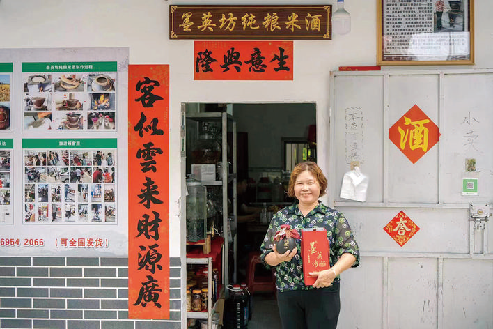 “很受歡迎,有不少回頭客。很多游客都循酒香而來(lái),品嘗購(gòu)買。除了自用,還有不少游客當(dāng)手信帶回去。”英姐在外打拼多年的兒子朱美錠如今也回到墨園村,幫助家里經(jīng)營(yíng)墨英酒坊的銷售門店——英姐農(nóng)產(chǎn)品店。他表示,不少游客主動(dòng)加其微信后,時(shí)常在線上訂購(gòu),目前店里基本每天有訂單發(fā)往周邊城市。憑借著傳統(tǒng)工藝釀造的好酒,墨英酒坊正成為墨園村文旅的一景,以酒文化為載體,講述墨園村的發(fā)展故事。