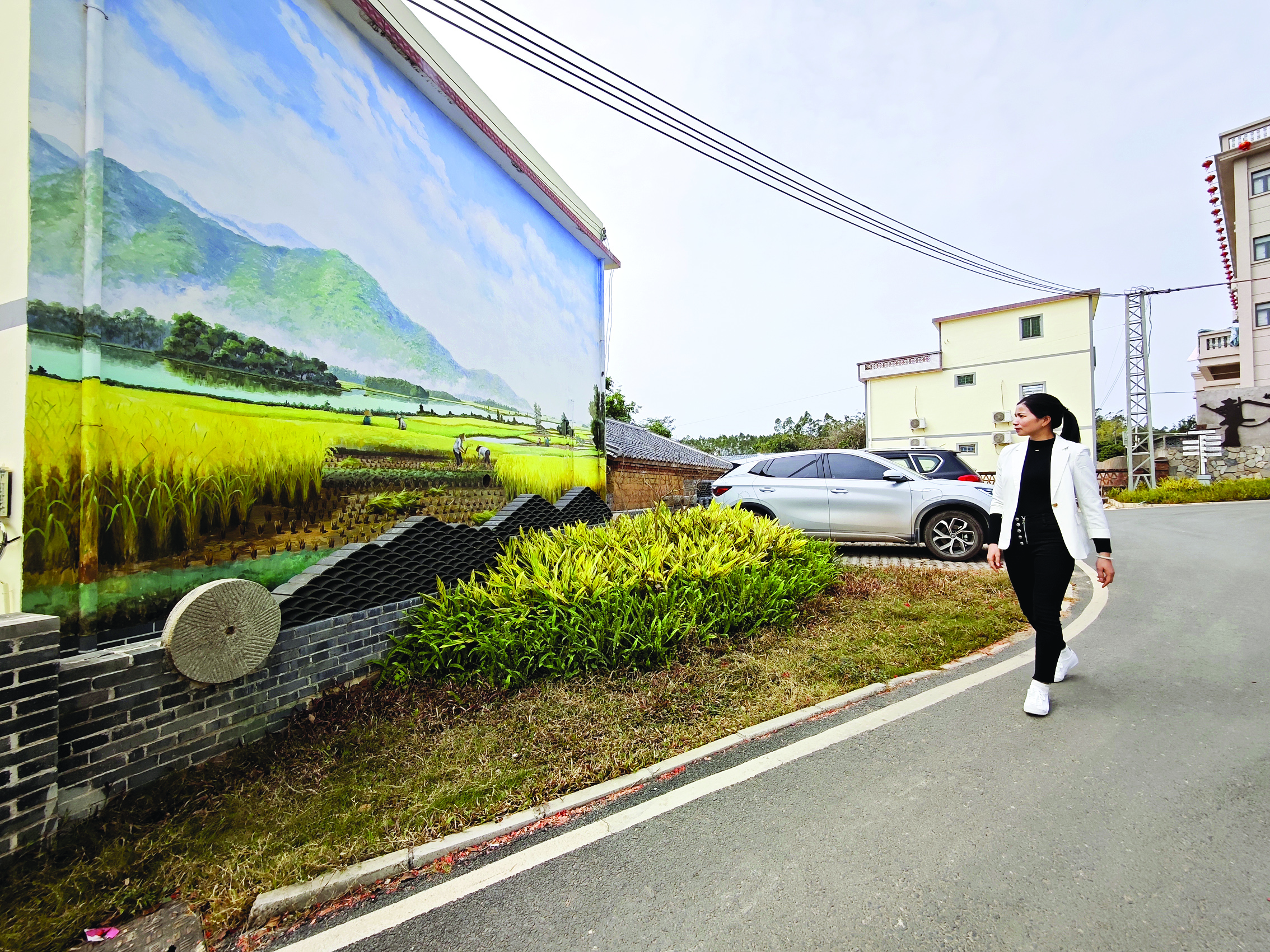 冼英在車村村內(nèi)散步。
