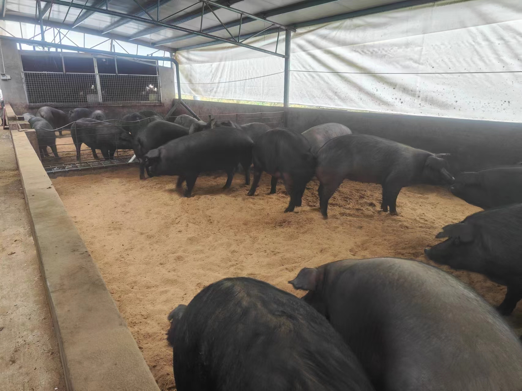 泓泉農(nóng)業(yè)生豬養(yǎng)殖基地里肥頭大耳、長(zhǎng)著黑毛的香豬。