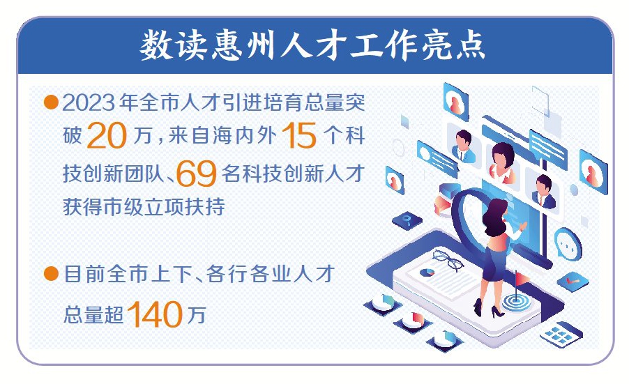 2023年,惠州人才引進(jìn)培育總量突破20萬(wàn),取得前所未有的良好成績(jī)。來(lái)自海內(nèi)外15個(gè)科技創(chuàng)新團(tuán)隊(duì)、69名科技創(chuàng)新人才獲得市級(jí)立項(xiàng)扶持,一大批青年人才來(lái)到惠州創(chuàng)業(yè)就業(yè)。