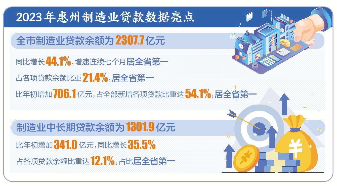 過去一年,惠州堅持“制造業(yè)當(dāng)家”。在金融支持制造業(yè)方面,惠州制造業(yè)貸款4項指標(biāo)排名保持全省第一。截至2023年末,全市制造業(yè)貸款余額2307.7億元,同比增長44.1%,增速連續(xù)七個月居全省第一。
