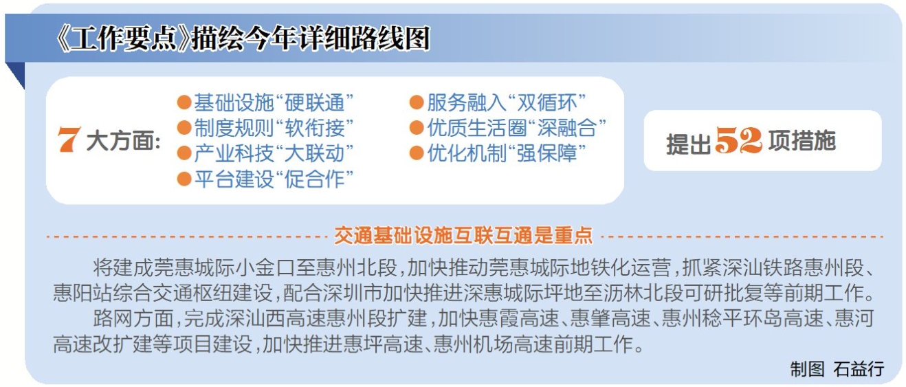 在大灣區(qū),惠州如何進一步強化東部樞紐門戶地位?《工作要點》描繪了今年的詳細路線圖,聚焦基礎(chǔ)設(shè)施“硬聯(lián)通”、制度規(guī)則“軟銜接”、產(chǎn)業(yè)科技“大聯(lián)動”、平臺建設(shè)“促合作”、服務(wù)融入“雙循環(huán)”、優(yōu)質(zhì)生活圈“深融合”、優(yōu)化機制“強保障”等七大方面,提出了52項措施,并明確了相應(yīng)的責(zé)任單位進行落實。