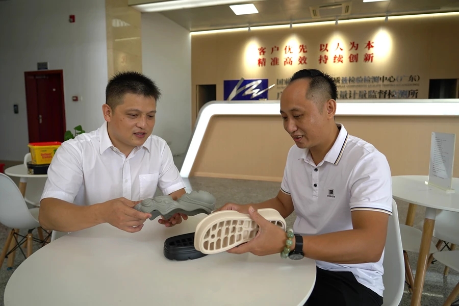 這是一家2022年才在惠東開業(yè)的鞋廠,引進了溫州一家鞋企的橡塑發(fā)泡材料用于生產(chǎn)坡跟女鞋等,相比傳統(tǒng)的厚鞋底,這種材料制作的鞋底輕便不累腳,可以把女鞋穿出運動鞋的腳感,廣受消費者青睞!拔覀兊目蛻魧ζ焚|(zhì)管控要求高,要出一份檢測報告給他,主要檢測耐磨性和環(huán)保相關指標!痹摴靖笨偨(jīng)理黃惠標表示,在國家鞋檢中心投用前,公司要檢測得把產(chǎn)品送到廣州或東莞,檢測一次要花幾百到上千元,時間和資金成本不少,家門口有了國家鞋檢中心后,不僅方便還免費,幫助企業(yè)降本提質(zhì)。