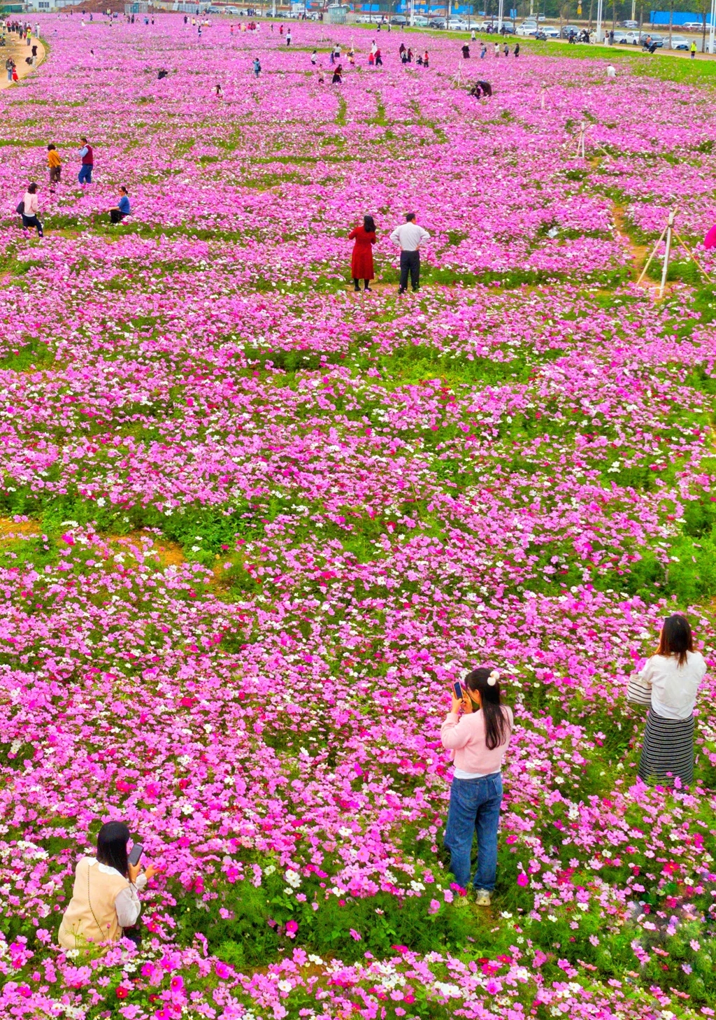 惠城區(qū)小金河大道路邊上有30畝格桑花盛開(kāi),吸引了許多游客觀(guān)賞打卡。