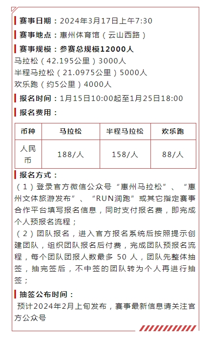選手可從賽事官方微信公眾號“惠州文體旅游發(fā)布”進入報名系統(tǒng)填寫報名信息,完成報名;蛟诠俜胶献鰽PP馬拉馬拉或數(shù)字心動注冊并報名。抽簽結果預計將于2024年2月上旬公布。