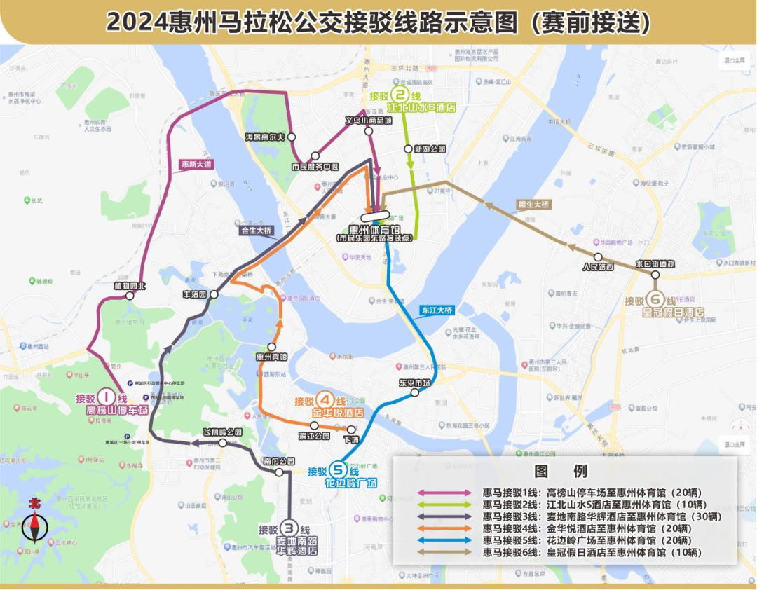 5號線接駁路線走向:花邊嶺廣場→麥地路→西枝江橋→東湖西路→東平大道→東江大橋→惠州大道→市民樂園東路