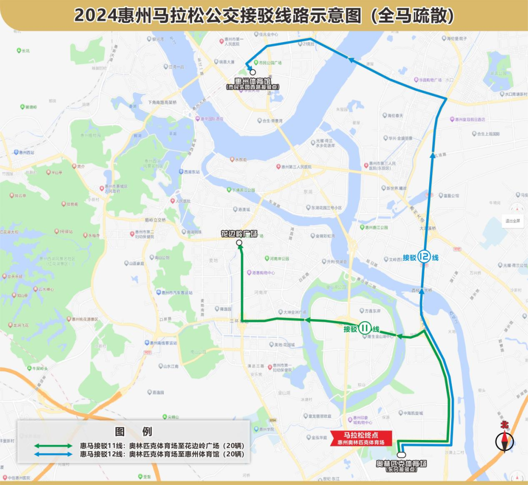 11號線接駁路線走向:奧林匹克體育場東門→四環(huán)南路→惠澳大道→三環(huán)南路→演達大道→花邊嶺廣場