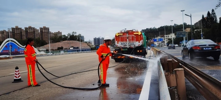 2月5日,在白云前收費站,惠州市交通運輸局仲愷區(qū)分局,區(qū)環(huán)衛(wèi)部門組織人員對高速公路收費站出入口護欄、圍欄進行集中清洗。