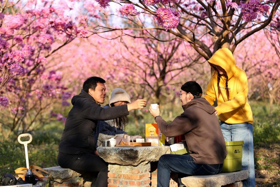 在江門市新會區(qū)大澤鎮(zhèn)山頭坪,游客在花海中泡茶(2023年1月29日攝)。新華社發(fā)(黃繼明攝)