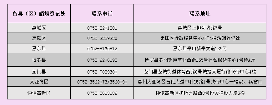 惠州市各婚姻登記處辦公地址及聯(lián)系電話