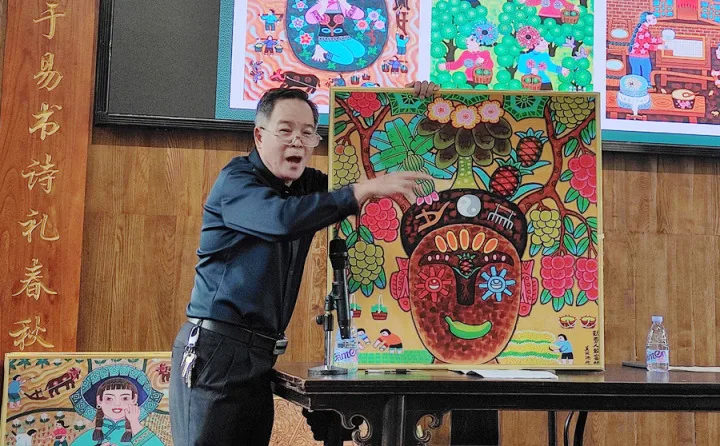 講座中,王漢池講述了龍門農(nóng)民畫的發(fā)展歷史、繪畫技巧和主要成就,他以自己的作品《客家山歌農(nóng)民畫組畫》為例,闡述龍門農(nóng)民畫是一種隨著時(shí)代發(fā)展而不斷創(chuàng)新發(fā)展的畫種,充滿藝術(shù)張力和生命力。
