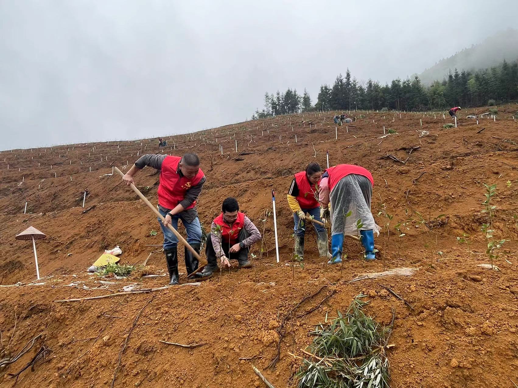 古洞村黨員干部在村集體山林上種植茶苗。 惠州日?qǐng)?bào)記者黃宇翔 攝