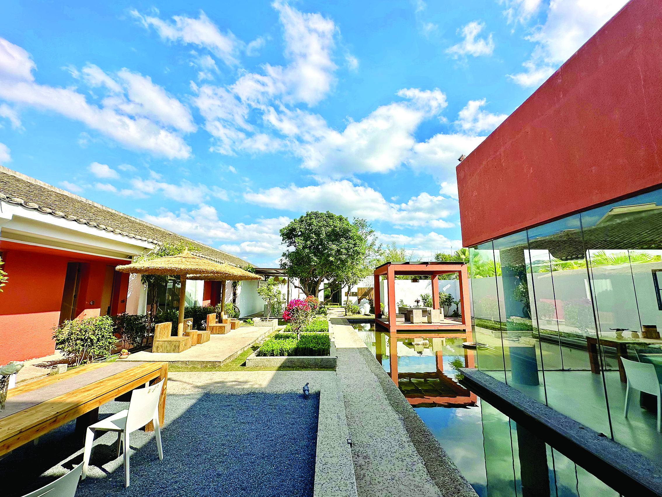 近日,記者來(lái)到位于博羅觀音閣南坑村東江邊的惠云!ど嚼镌鹤,只見(jiàn)民宿門(mén)口大片的格;ê托‰r菊開(kāi)得正艷。走進(jìn)院子,潺潺水聲婉轉(zhuǎn)而來(lái),木桌石臺(tái)有序擺布;漫步于庭院,兩棵蔥郁的荔枝樹(shù)花開(kāi)正盛,別樣小巧的院內(nèi)景觀設(shè)計(jì)讓人眼前一亮;拾級(jí)而上,樓頂恒溫泳池和休閑區(qū)提供了極佳風(fēng)景視野,抬眼便可欣賞奔流的東江、青翠的竹林和逶迤的遠(yuǎn)山。