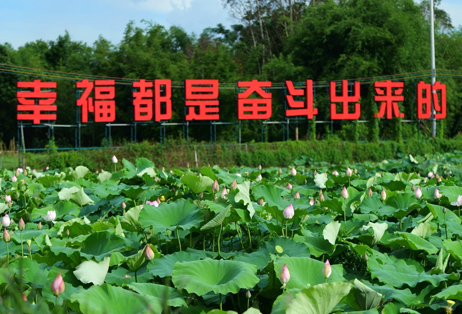 “幸福都是奮斗出來(lái)的”,顯眼紅色的大字和綠色的荷花交相輝映。三嘉村是廣東省“百千萬(wàn)工程”首批典型村。