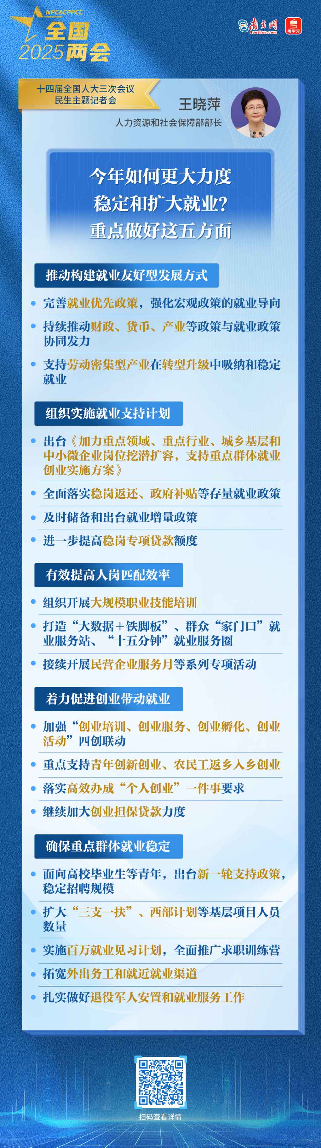 王曉萍補(bǔ)充,就業(yè)是家事,更是國事,今年政府工作報(bào)告明確經(jīng)濟(jì)增長(zhǎng)5%左右的預(yù)期目標(biāo),體現(xiàn)了穩(wěn)就業(yè)、惠民生的需要。明確城鎮(zhèn)調(diào)查失業(yè)率5.5%左右、城鎮(zhèn)新增就業(yè)1200萬人以上的就業(yè)目標(biāo),體現(xiàn)了更大力度穩(wěn)定和擴(kuò)大就業(yè)的要求,重點(diǎn)做好五個(gè)方面的工作: