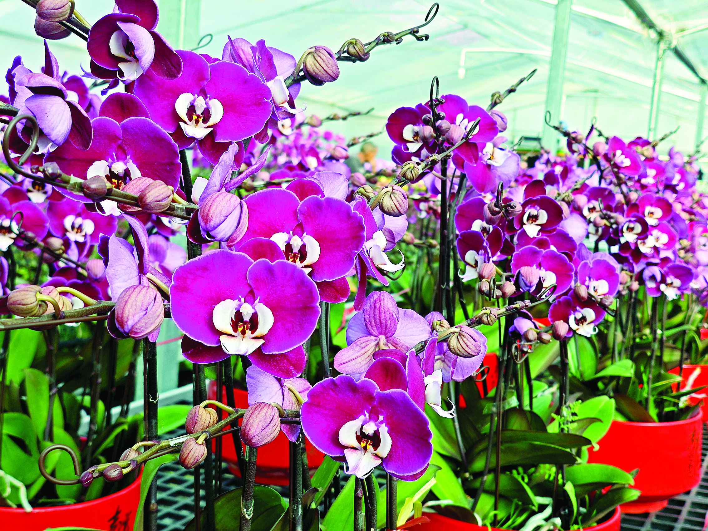 蝴蝶蘭的嬌艷綻放離不開(kāi)精心培育。楊惠英說(shuō),為了讓蝴蝶蘭在春節(jié)前如約綻放,基地提前5個(gè)月就開(kāi)始培育工作。為了給蝴蝶蘭營(yíng)造最適宜的生長(zhǎng)環(huán)境,種植戶們時(shí)刻緊盯大棚內(nèi)溫度和濕度變化!霸诜N植蝴蝶蘭這方面,我們的技術(shù)團(tuán)隊(duì)有著30多年的種植經(jīng)驗(yàn)!睏罨萦⒄f(shuō),他們會(huì)依據(jù)蝴蝶蘭不同生長(zhǎng)階段,精確配比肥料濃度與澆水量,并通過(guò)調(diào)控溫度、光照時(shí)長(zhǎng)等,讓蝴蝶蘭在預(yù)定時(shí)間嬌艷綻放,為產(chǎn)業(yè)規(guī)模的擴(kuò)大、產(chǎn)品品質(zhì)的提升奠定了堅(jiān)實(shí)基礎(chǔ)。