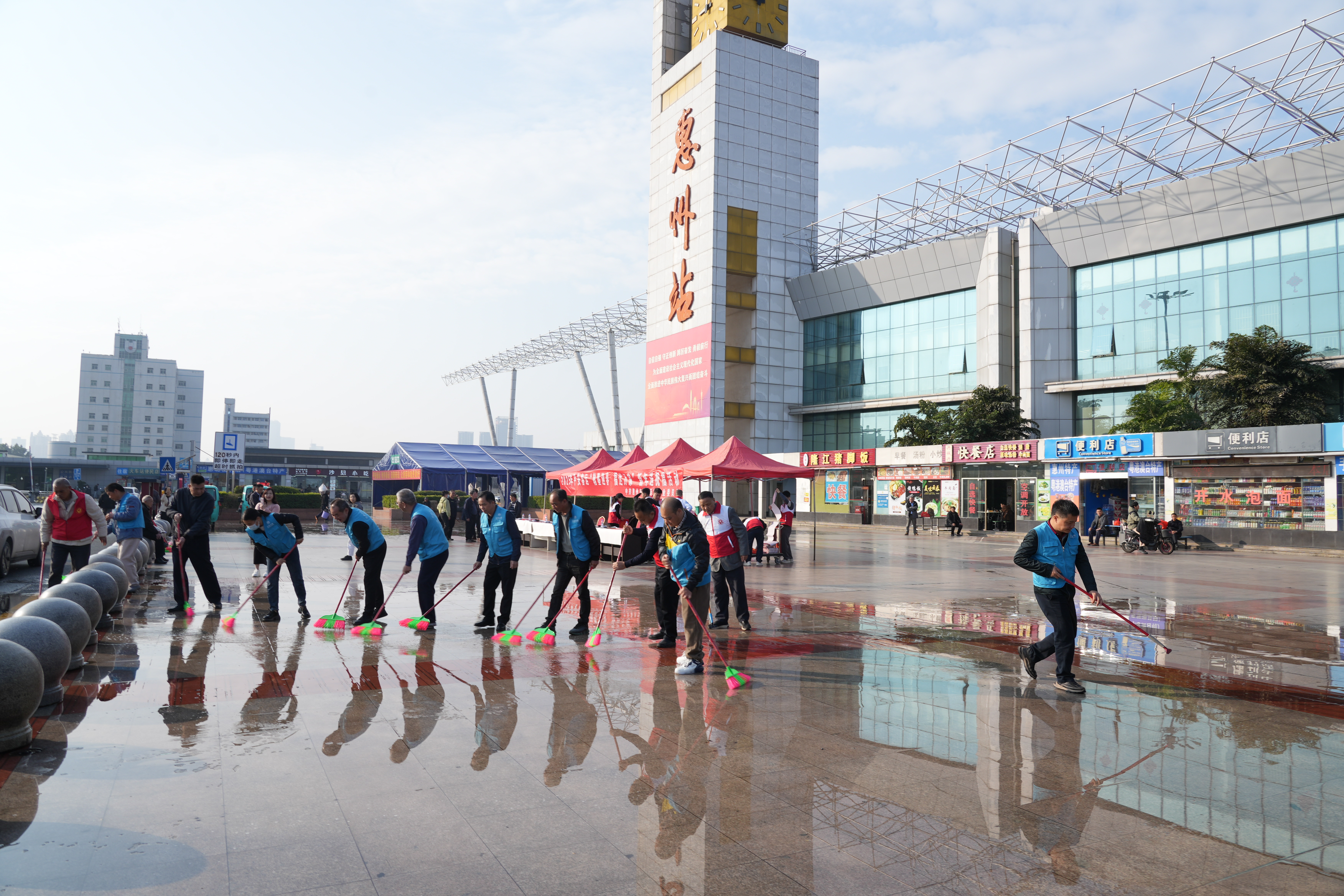 志愿者及環(huán)衛(wèi)工人在惠州火車站清掃;葜萑?qǐng)?bào)記者朱金贊 攝