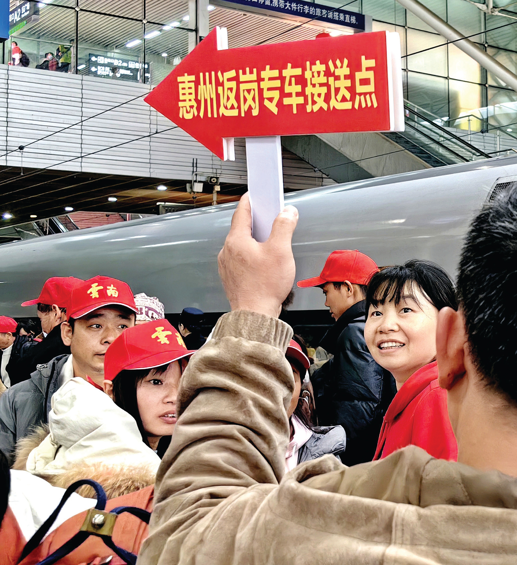 惠州市人社部門工作人員在深圳北高鐵站迎接返惠務(wù)工人員。 惠州日報記者李松權(quán) 實習生鄭昊陽 攝