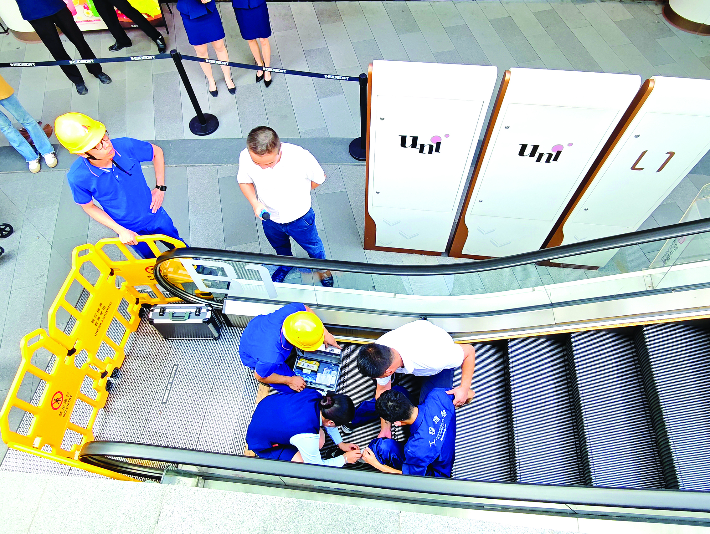 惠州市市場監(jiān)督管理局走進商場開展“電梯安全宣傳周”活動,圖為自動扶梯應(yīng)急救援演練。