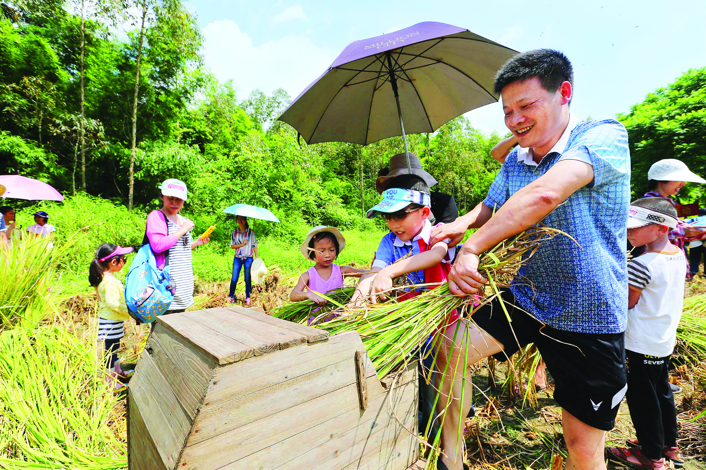 游人在博羅縣公莊鎮(zhèn)體驗(yàn)打稻谷。