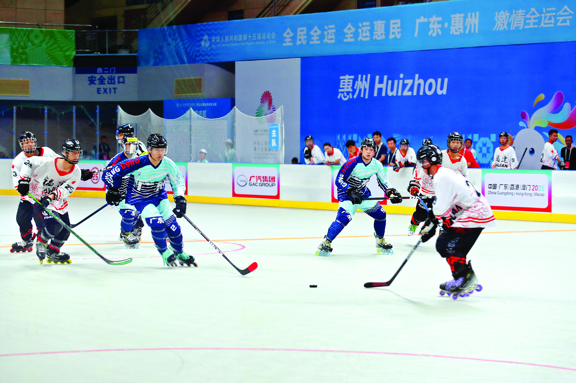 10月15日晚,第十五屆全運會單排輪滑球項目決賽男子組小組賽,廣東隊(藍衣)13:1戰(zhàn)勝福建隊(白衣)。 惠州日報記者鐘暢新 攝