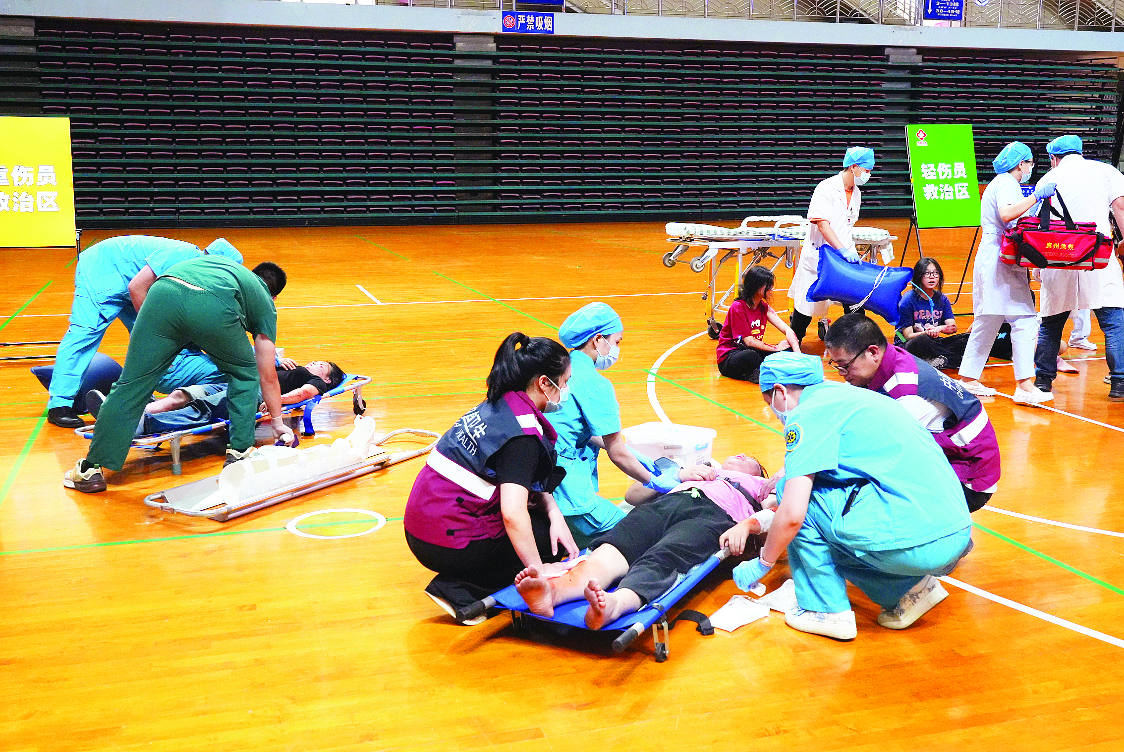 “報告!剛剛惠州體育館C館觀眾席突發(fā)意外事件,多名群眾受傷,請立即派救護車過來!”當(dāng)天下午3時,比賽期間體育館現(xiàn)場醫(yī)療站負責(zé)人的緊急呼叫瞬間點燃了戰(zhàn)備狀態(tài)。