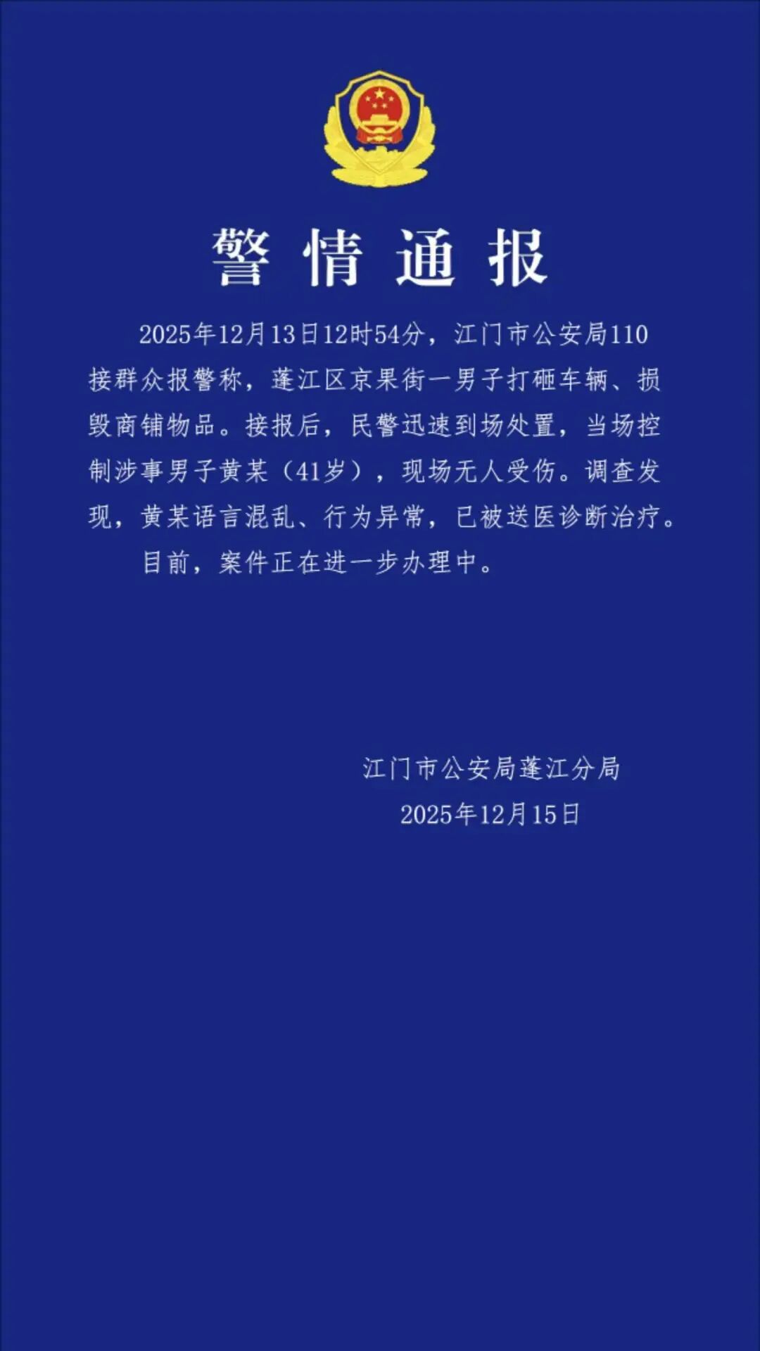 12月15日晚上,廣東省江門市公安局蓬江分局發(fā)布警情通報(bào)稱: