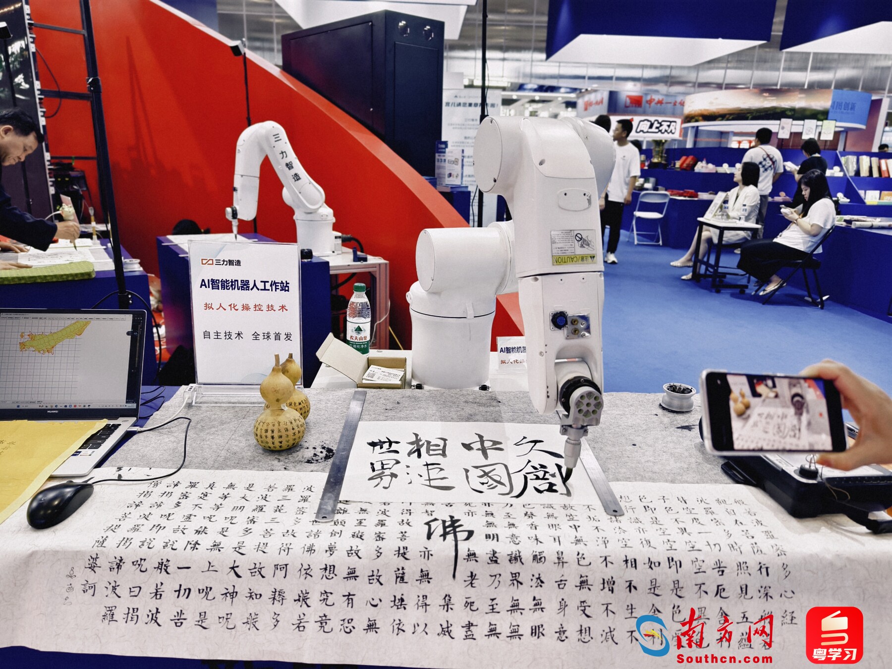 在文博會(huì)的現(xiàn)場,來自新疆三力的智能機(jī)器人,通過靈活的機(jī)械臂寫書法、畫國畫,連1.5毫米的微楷也不在話下?瑫、行書、草書……樣樣精通,還能繪制墨竹國畫作品,以書法繪畫展現(xiàn)“東方美學(xué)與科技融合”的魅力。