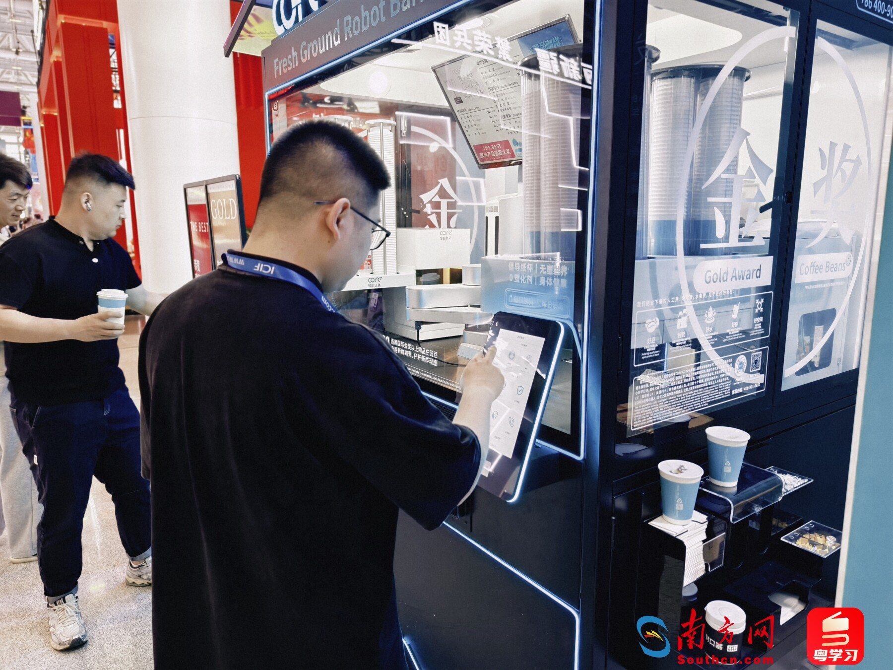 走進(jìn)文博會(huì)10號(hào)館展廳,映入眼簾的“COFE+機(jī)器人現(xiàn)磨咖啡”展位吸引了不少游客觀眾駐足排隊(duì)。作為展位負(fù)責(zé)人,上海氦豚機(jī)器人科技有限公司創(chuàng)始人韓非子(韓兆林)正忙碌地為客人介紹產(chǎn)品。