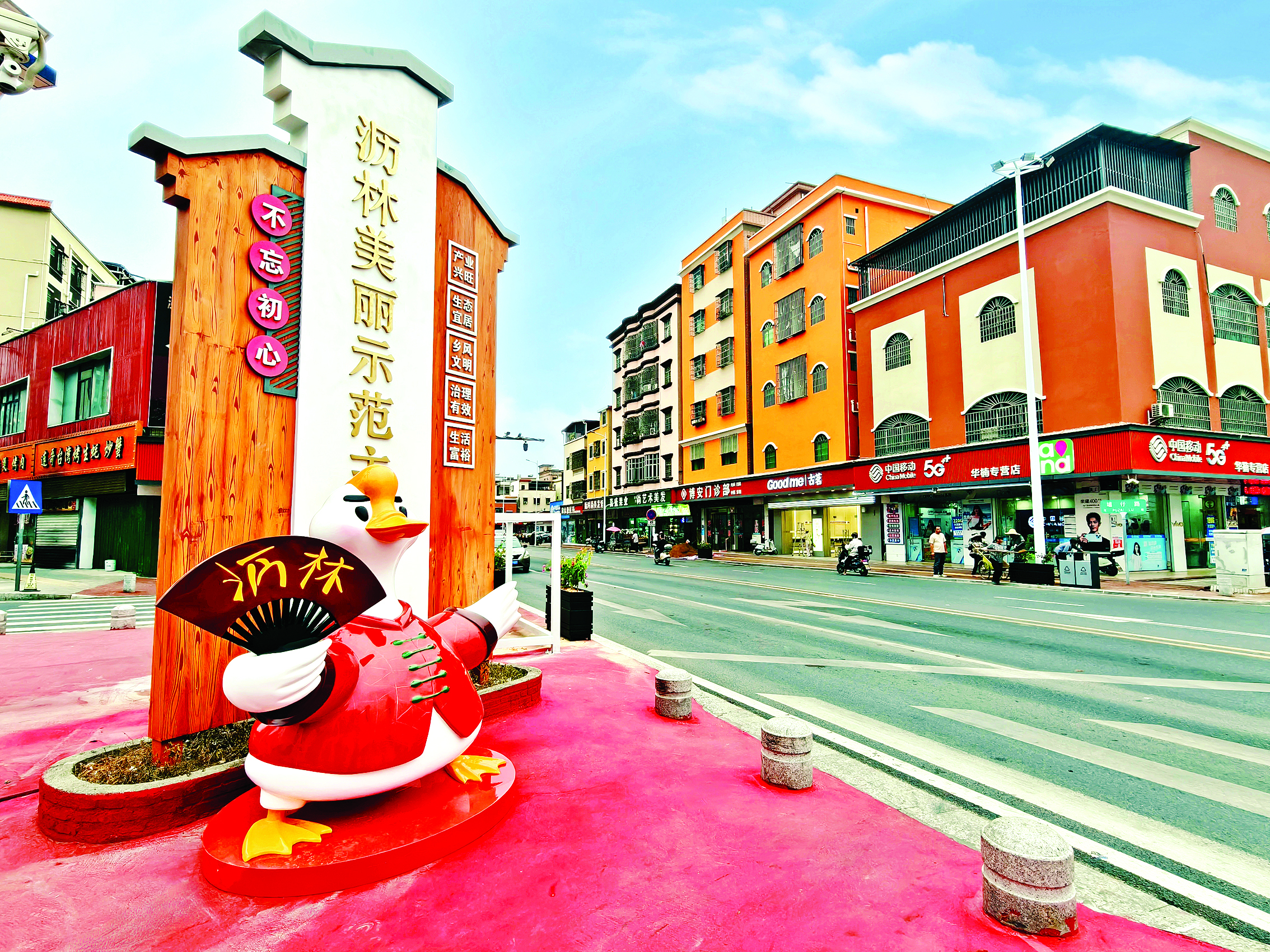 漫步埔仔路示范主街,這里的連廊式建筑保留著嶺南建筑風(fēng)格,一面面“莫小鵝”主題文化墻成為網(wǎng)紅打卡點(diǎn)。該鎮(zhèn)不僅規(guī)范了商鋪店招,還拓寬人行道6080平方米,新增停車位150個(gè)、路燈56盞;同步推進(jìn)“三線”下地10.04公里、捆扎規(guī)整17公里,2048棟農(nóng)房褪去斑駁舊貌,換上統(tǒng)一雅致“新裝”。