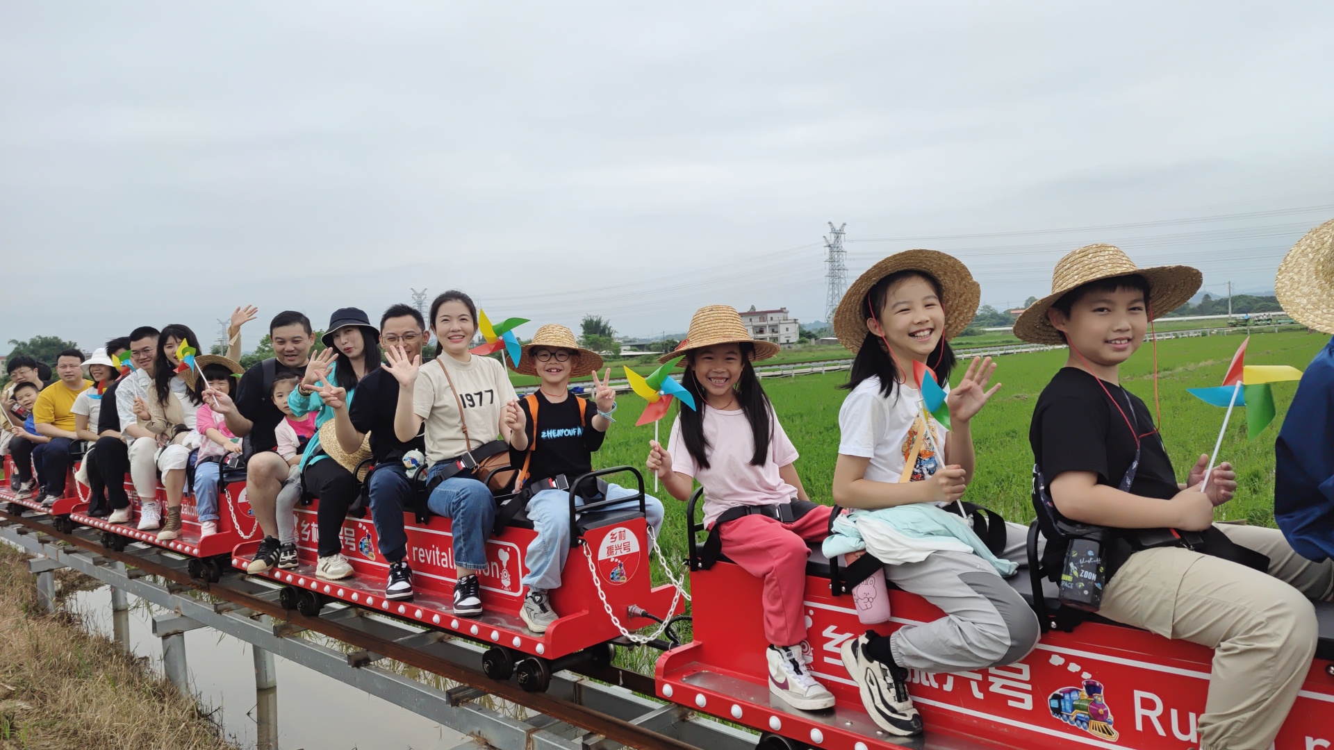 橫瀝鎮(zhèn)墨園村里,游客開心地乘坐稻田小火車。 惠州日報記者謝菁菁 通訊員張雅 攝