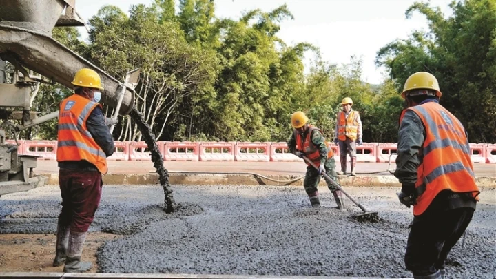 省道254線龍門路段,工人在擴(kuò)建道路上澆筑混凝土。