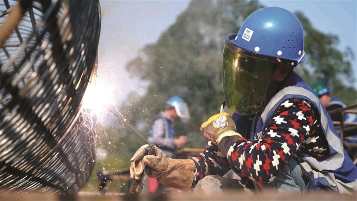 縣道219線龍華路段橋梁施工現(xiàn)場,工人在焊接鋼筋籠。