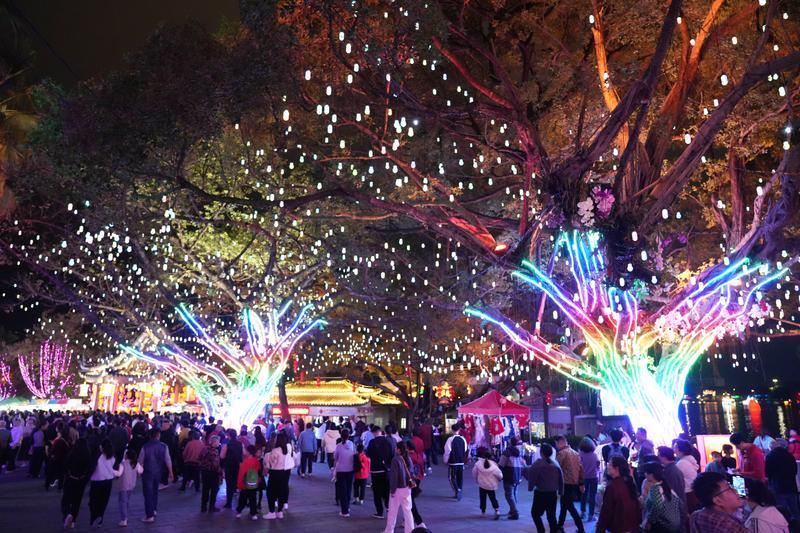 惠州西湖景區(qū)游人如織,或觀賞花燈,或拍照留念。本組圖片 惠州日報記者朱金贊 鐘暢新 攝