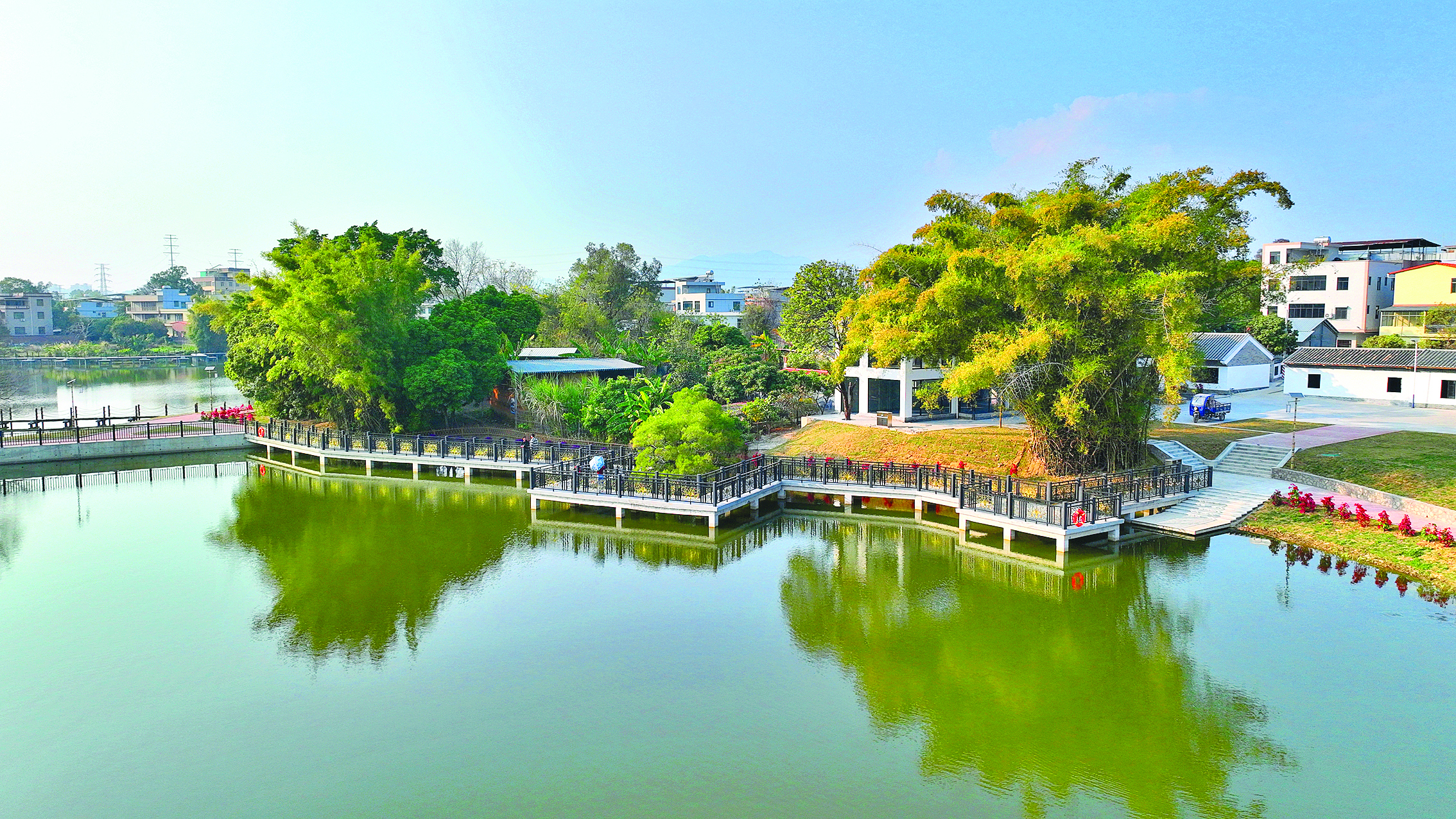 走進(jìn)星光穗園,映入眼簾的是一個開闊的景觀湖,湖邊親水棧道蜿蜒向前,沿途紅艷艷的三角梅開得正好,一棵茂盛的相思樹橫伸向湖面,生動演繹出“疏影橫斜水清淺”的意境。三三兩兩的村民和游客行走其間,停留在一處處美景前打卡。竹林掩映下,修舊如舊的老屋已有商家入駐開門納客。