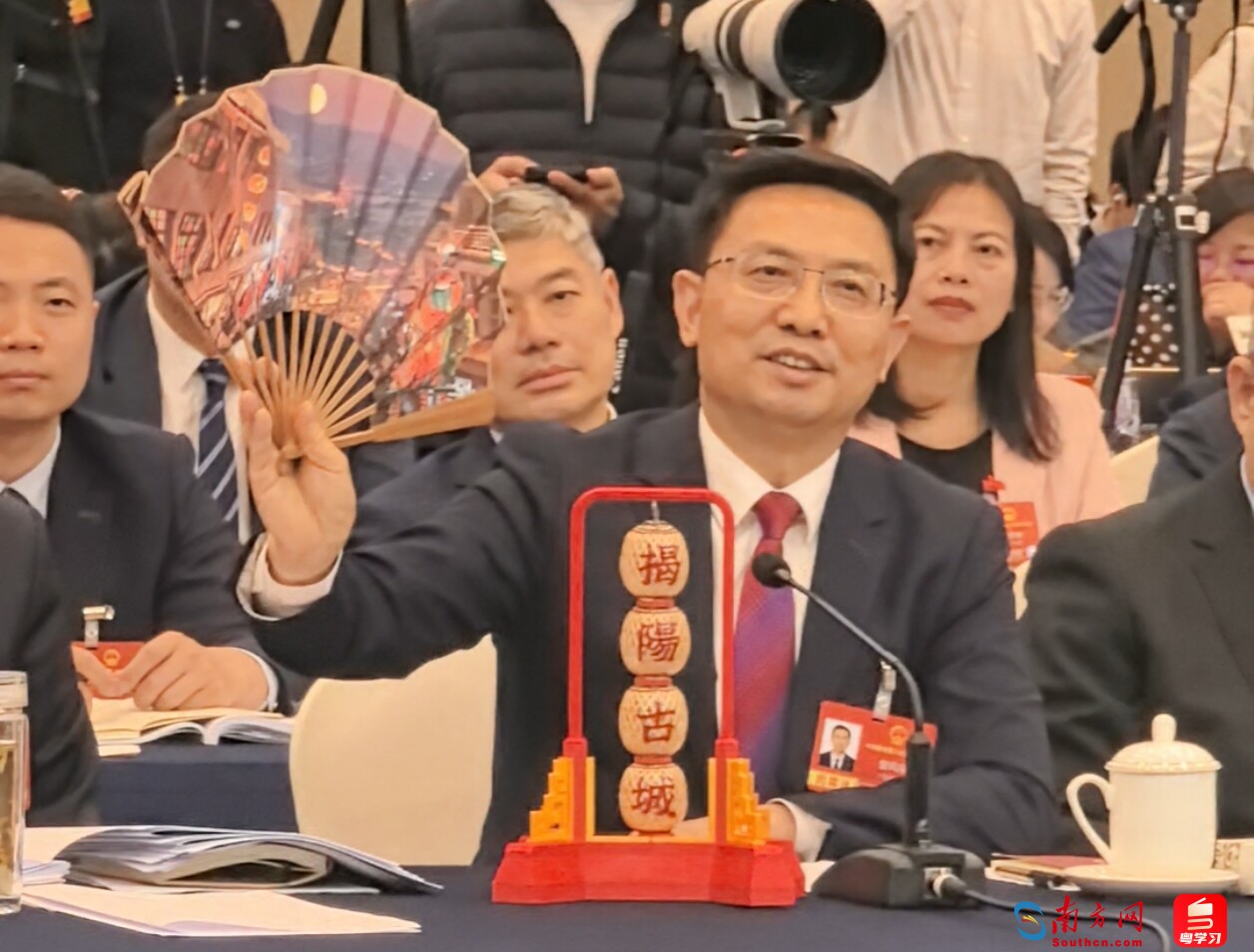 全國人大代表、揭陽市委書記曾風(fēng),F(xiàn)場展示揭陽古城特色小燈籠與古風(fēng)折扇,熱情推介揭陽古城保育活化成果,邀請八方賓客“尋千年文脈、品人間美味”。數(shù)據(jù)顯示,2026年春節(jié)期間,僅1.3平方公里的揭陽古城就接待游客238萬人次,增長87%。放眼廣東全省,今年春節(jié)期間全省共接待游客8658.9萬人次,較2025年春節(jié)假期八天增長8.1%,實現(xiàn)旅游收入848.9億元,增長13.9%,兩項核心數(shù)據(jù)均創(chuàng)歷史新高,位居全國首位。