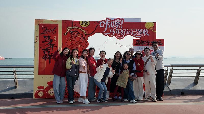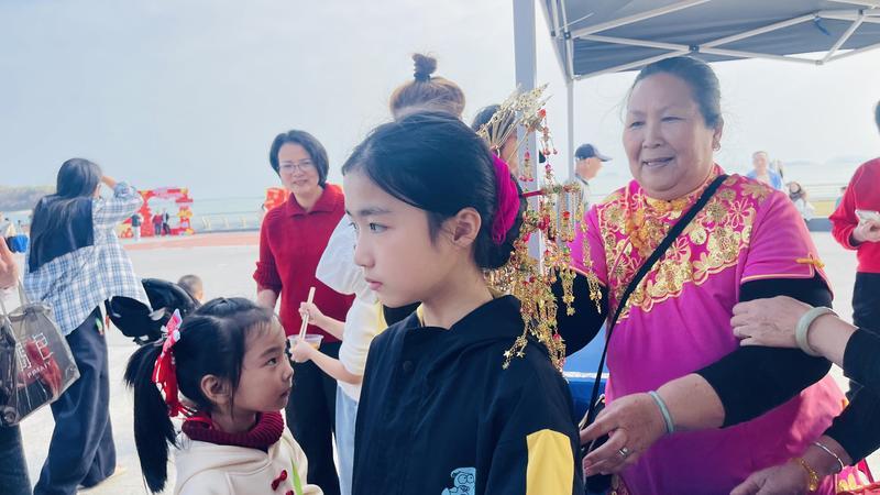 另一邊,漁家頭飾體驗區(qū)域同樣人頭攢動,傳承人為市民梳起“仙姑頭”,發(fā)髻上綴滿的金釵彩珠搖曳生姿,在陽光下光彩奪目,市民們紛紛夸贊并拿出手機拍下美麗別致的造型。全家福拍攝區(qū)域也成為現(xiàn)場備受歡迎的打卡點。廣場一側(cè)布置了充滿新春元素與漁家特色的拍攝背景,專業(yè)攝影師免費為市民游客定格團圓美滿瞬間,一家人其樂融融地站在鏡頭前,臉上洋溢著幸福的笑容,為新春增添了一份濃濃的溫情。