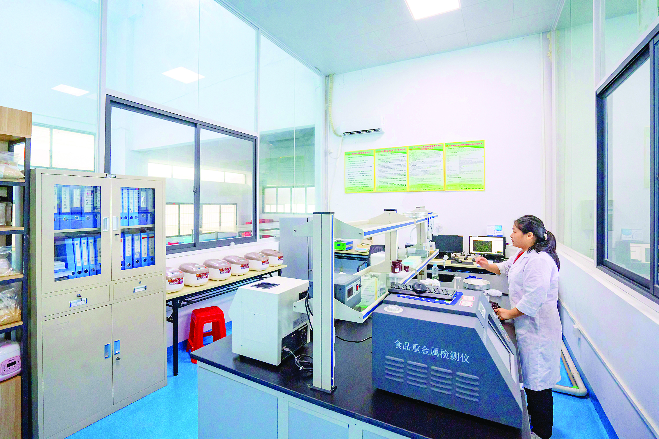 龍門縣絲苗米省級現(xiàn)代農(nóng)業(yè)產(chǎn)業(yè)園內(nèi),工作人員對大米進行檢測;葜輺|江圖片社供圖