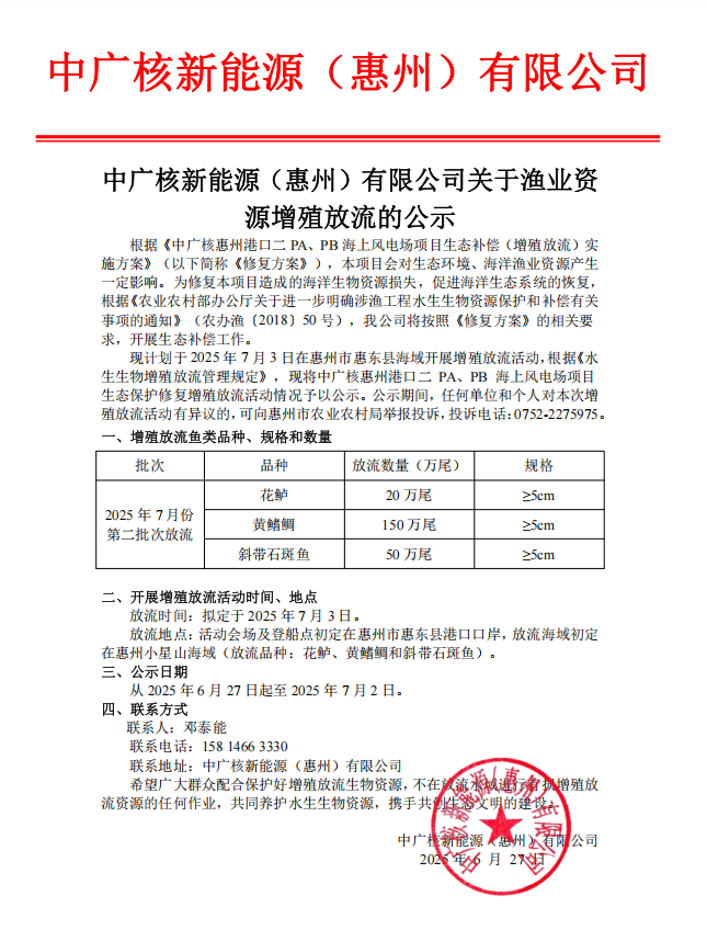 中廣核新能源(惠州)有限公司關于漁業(yè)資源增殖放流的公示
