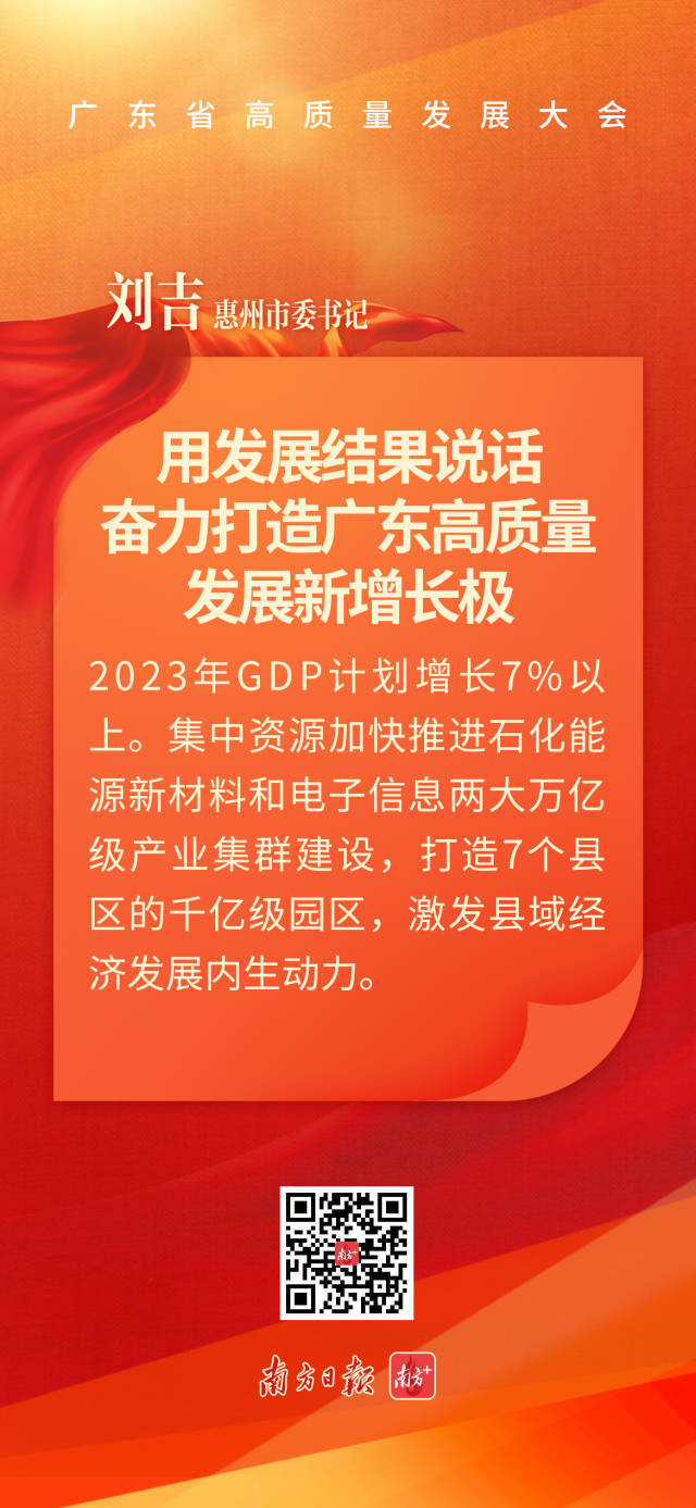 惠州市委書記劉吉表示,省委省政府開年第一天召開這次高質(zhì)量發(fā)展大會(huì),發(fā)出了大抓實(shí)體經(jīng)濟(jì)、加快高質(zhì)量發(fā)展的動(dòng)員令。惠州將奮發(fā)進(jìn)取、奮勇?tīng)?zhēng)先,堅(jiān)決落實(shí)好省委制造業(yè)當(dāng)家戰(zhàn)略,努力交出一份合格的惠州答卷。我們將保持近幾年向上向好的態(tài)勢(shì),2023年GDP計(jì)劃增長(zhǎng)7%以上。我們將集中資源加快推進(jìn)石化能源新材料和電子信息兩大萬(wàn)億級(jí)產(chǎn)業(yè)集群建設(shè),不斷增強(qiáng)產(chǎn)業(yè)核心競(jìng)爭(zhēng)力。我們將做強(qiáng)做優(yōu)3個(gè)國(guó)家級(jí)園區(qū)同時(shí)打造7個(gè)縣區(qū)的千億級(jí)園區(qū),激發(fā)縣域經(jīng)濟(jì)發(fā)展內(nèi)生動(dòng)力。我們清醒認(rèn)識(shí)到高質(zhì)量發(fā)展就是要實(shí)干興邦,惠州將腳踏實(shí)地、扎扎實(shí)實(shí)做好自己的事,用發(fā)展結(jié)果說(shuō)話,奮力打造廣東高質(zhì)量發(fā)展新增長(zhǎng)極。