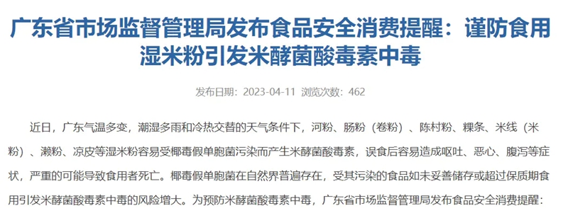 2020年7月28日,廣東省揭陽(yáng)市惠來(lái)地區(qū)也發(fā)生了一起食用河粉(粿條)導(dǎo)致的食物中毒事件,11人中毒,1人死亡,也是米酵菌酸毒素。