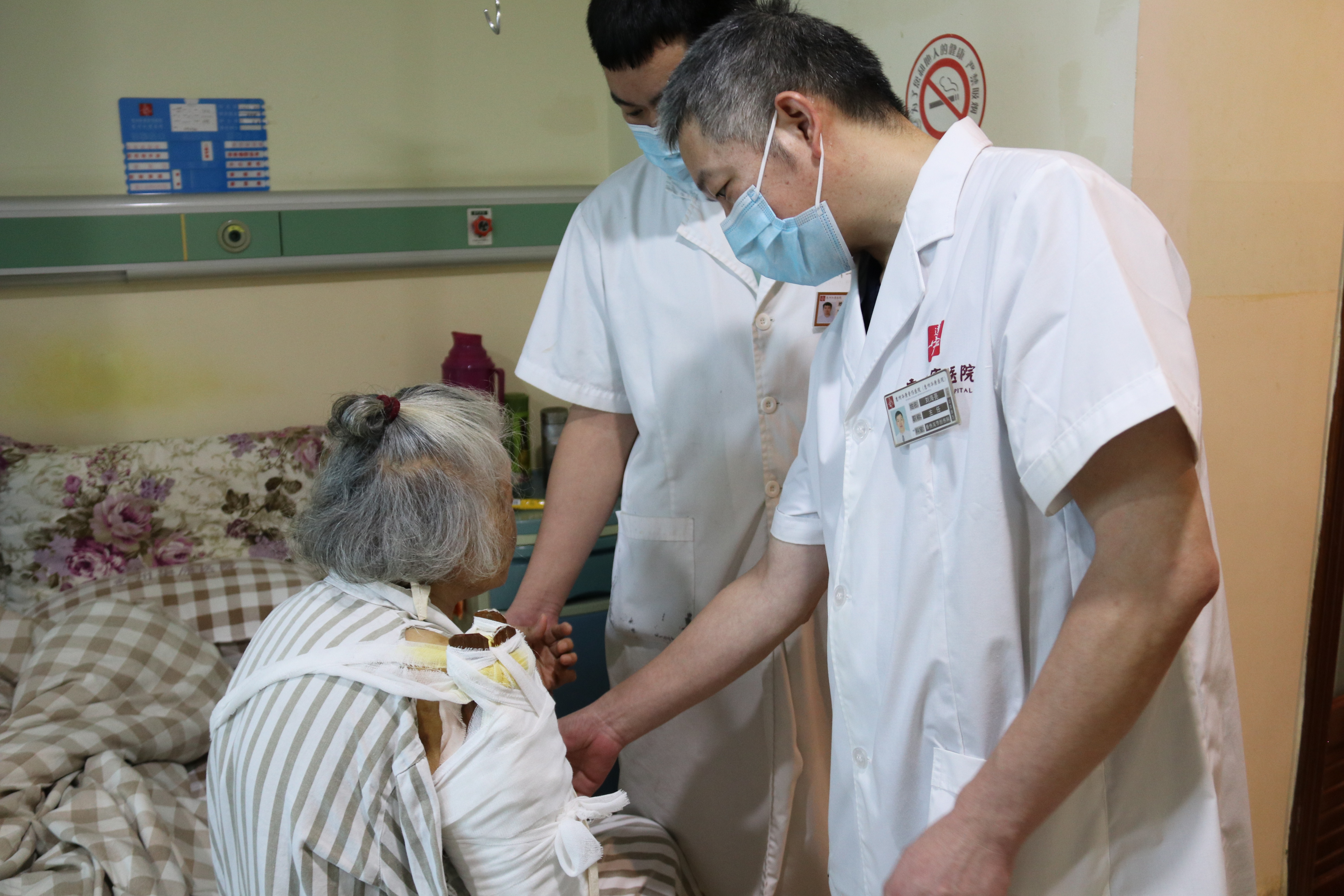 劉海亮(右一)查看高齡老人恢復(fù)情況。